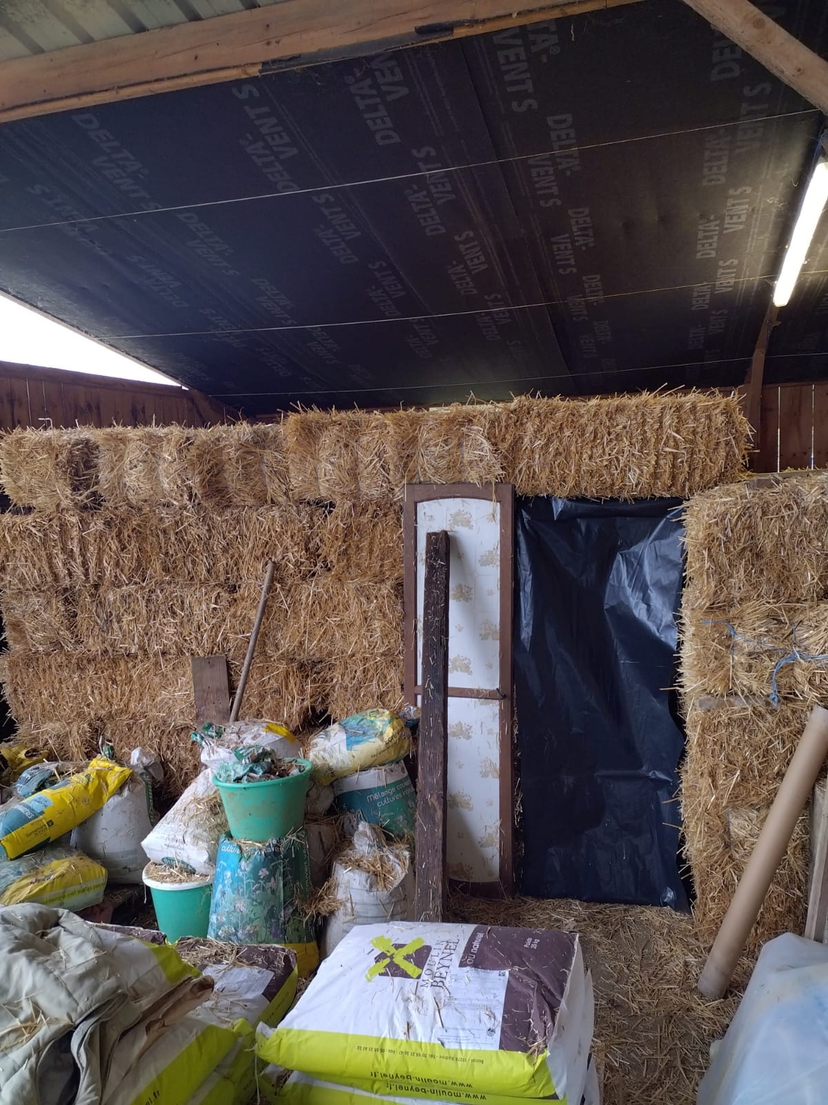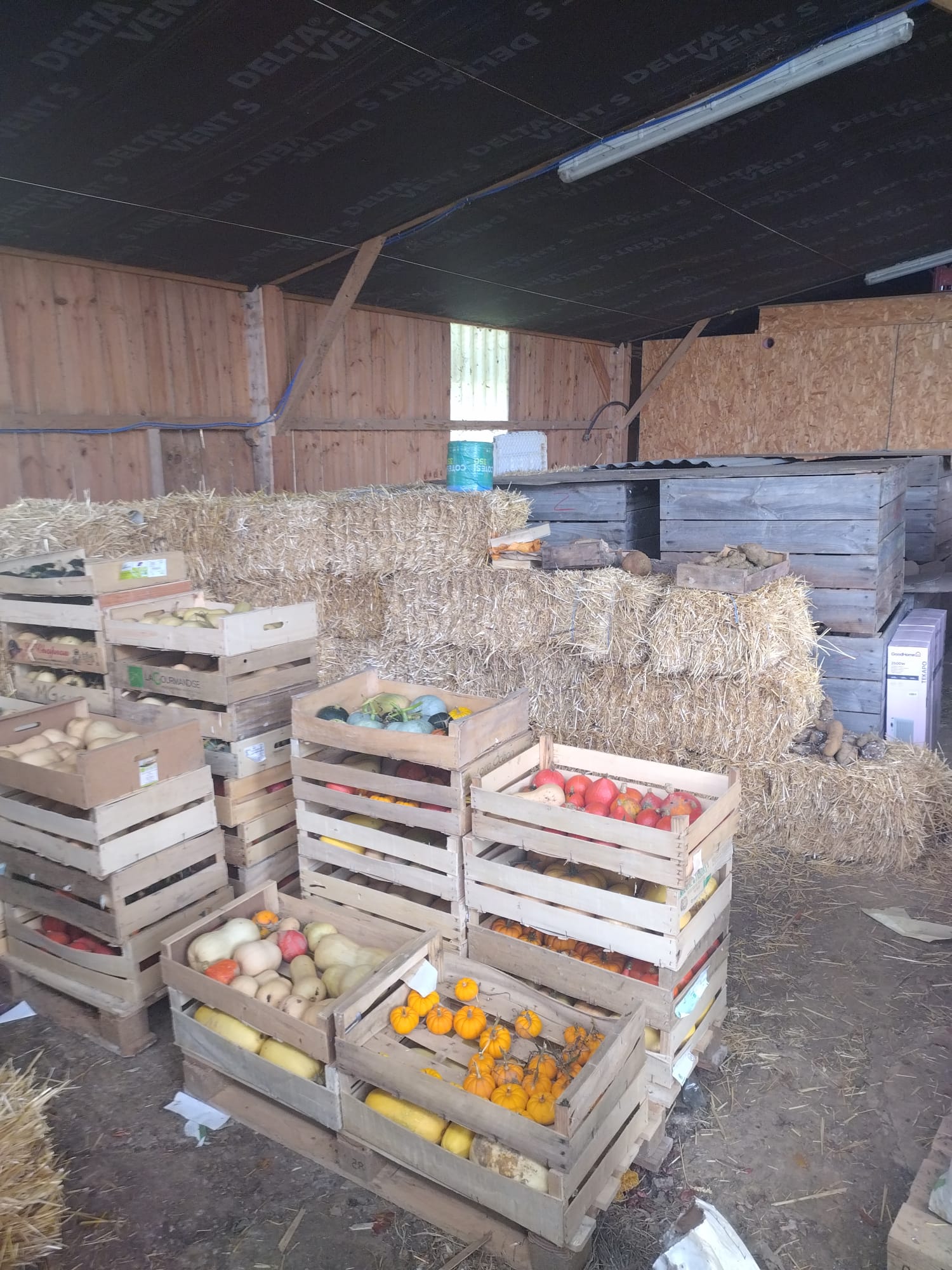 Chez Antoine, la récolte des patates douces est enfin terminée… Ouf ! Heureusement que les températures ne sont pas trop descendues avant. Pour les stocker, il construit deux zones de stockage en bottes de paille. Une chambre à 10-12 °C pour les courges et les patates douces, et une à 6-8 °C pour les pommes de terre. En attendant qu'il pose un puits canadien l'année prochaine, la température sera gérée par deux petits radiateurs à bain d'huile. 🤞🏼