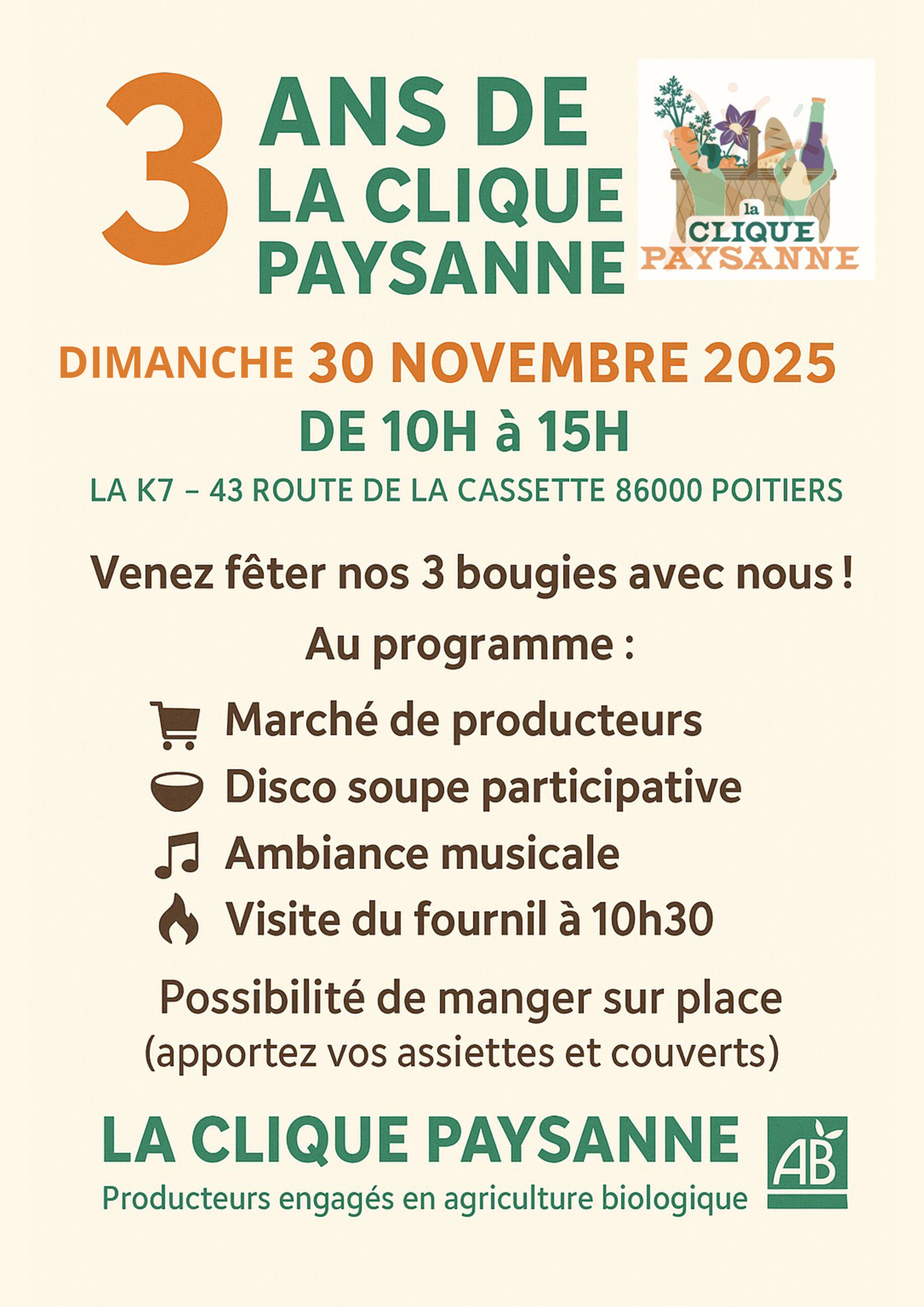 Vous pouvez passer commande jusqu'à DIMANCHE MINUIT pour être livré le mardi suivant entre 17h et 19h à Aslonnes, Décathlon-Vouneuil, Marçay, Ligugé, Poitiers ou St-Maurice-la-Clouère.